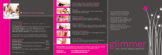 Glimmer Beauty Mobile Service has now been operating successfully in the Grafton area for some time and now provides an in-house service to those who prefer this option.