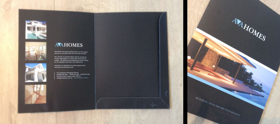 A complete Business Package Design with flyer and presentation folder add-ons for AVA Homes, a local Gold Coast property development company.