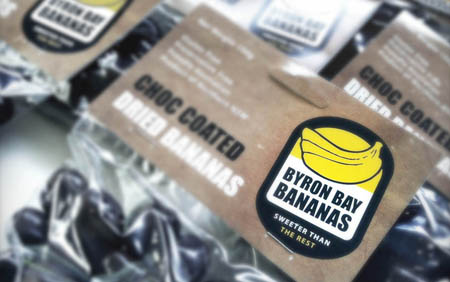 Byron Bay Bananas - Tweed Coast Food Label Design Choc coated dried bananas are covered in The Byron Bay Chocolate Company's delicious milk and dark chocolate (so good!) |